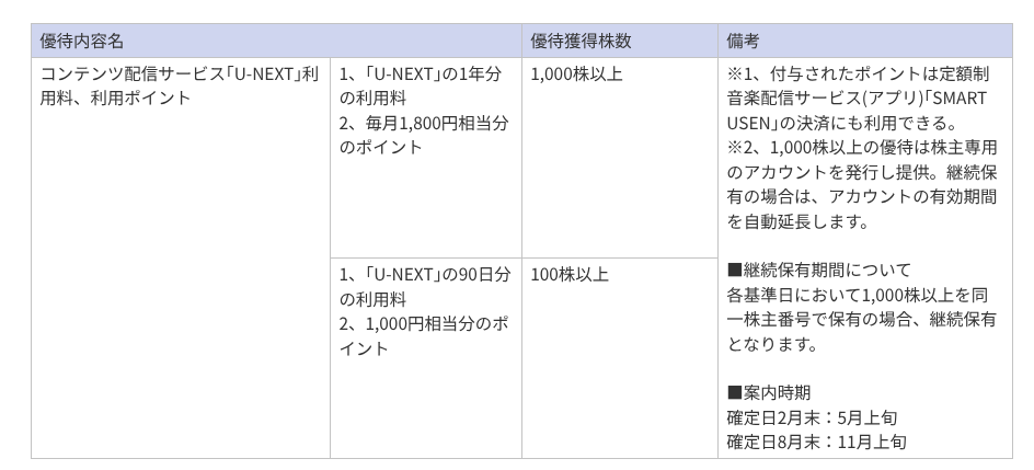 優待は社名にもなっているU-NEXTの無料期間とポイント付与